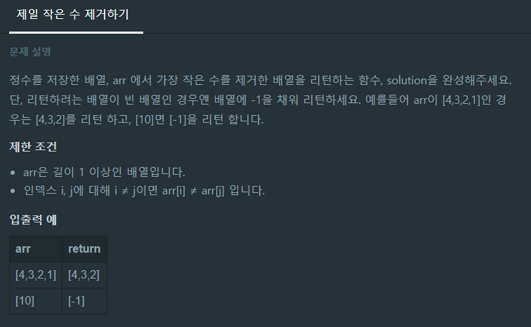 프로그래머스 알고리즘 연습 Level1 제일 작은 수 제거하기 본문